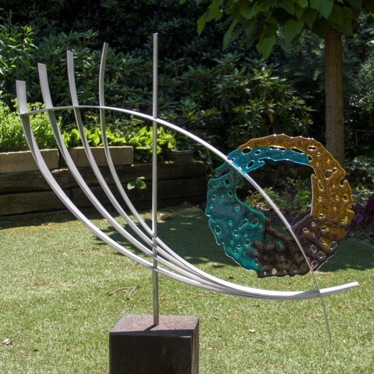 "Ocean race" Sculptuur uit geborsteld aluminium en glas. Sculpture of brushed aluminum and glass. Skulptur aus gebürstetem Aluminium und Glas. Format: H 55 x B 70 x D 30 cm incl. sokkel, inclusive base. Price; € 3295,-